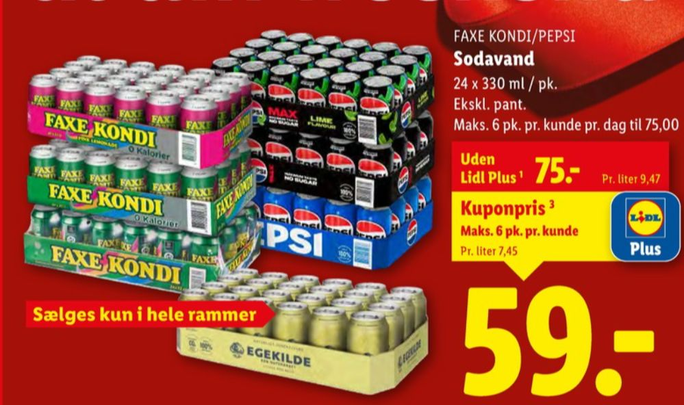 De sælger fra i morgen en ramme Pepsi Max til 59 kroner ligesom Lidl, men her skal man dog være lidt hurtigere.