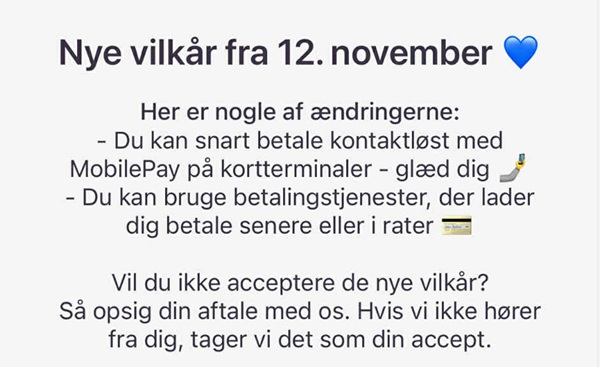 Hvis man ikke ønsker at acceptere de nye vilkår, opfordrer MobilePay til, at man opsiger sin aftale.