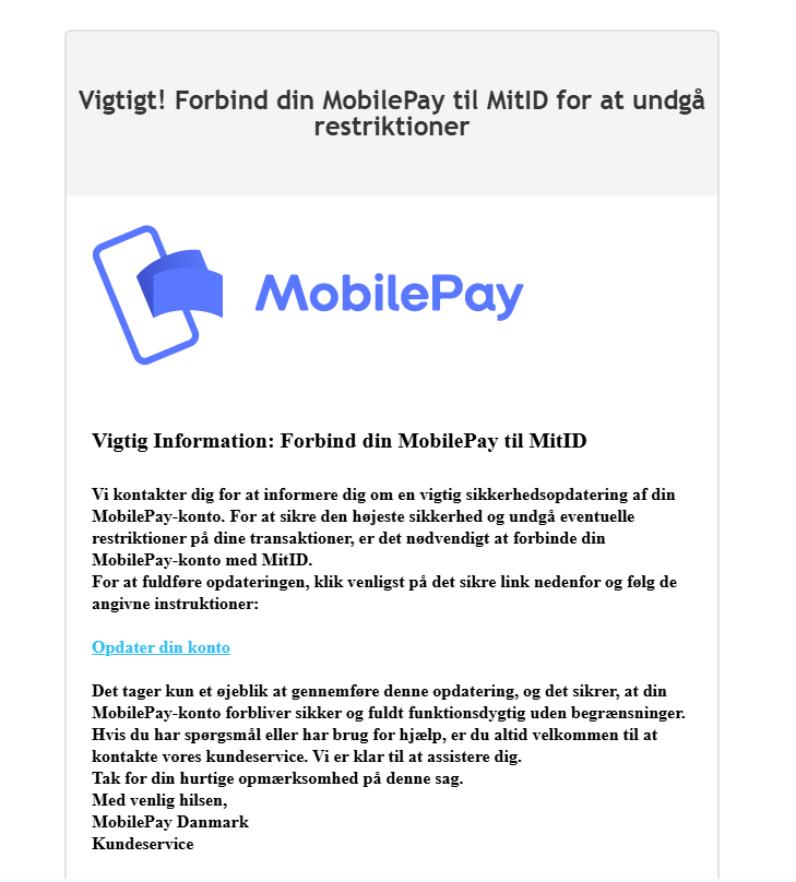 I mailen skriver svindlerne, at der er kommet en sikkerhedsopdatering til MobilePay. Svindlerne vil have dig til at følge et link, men det må du under ingen omstændigheder gøre – for så går det galt.