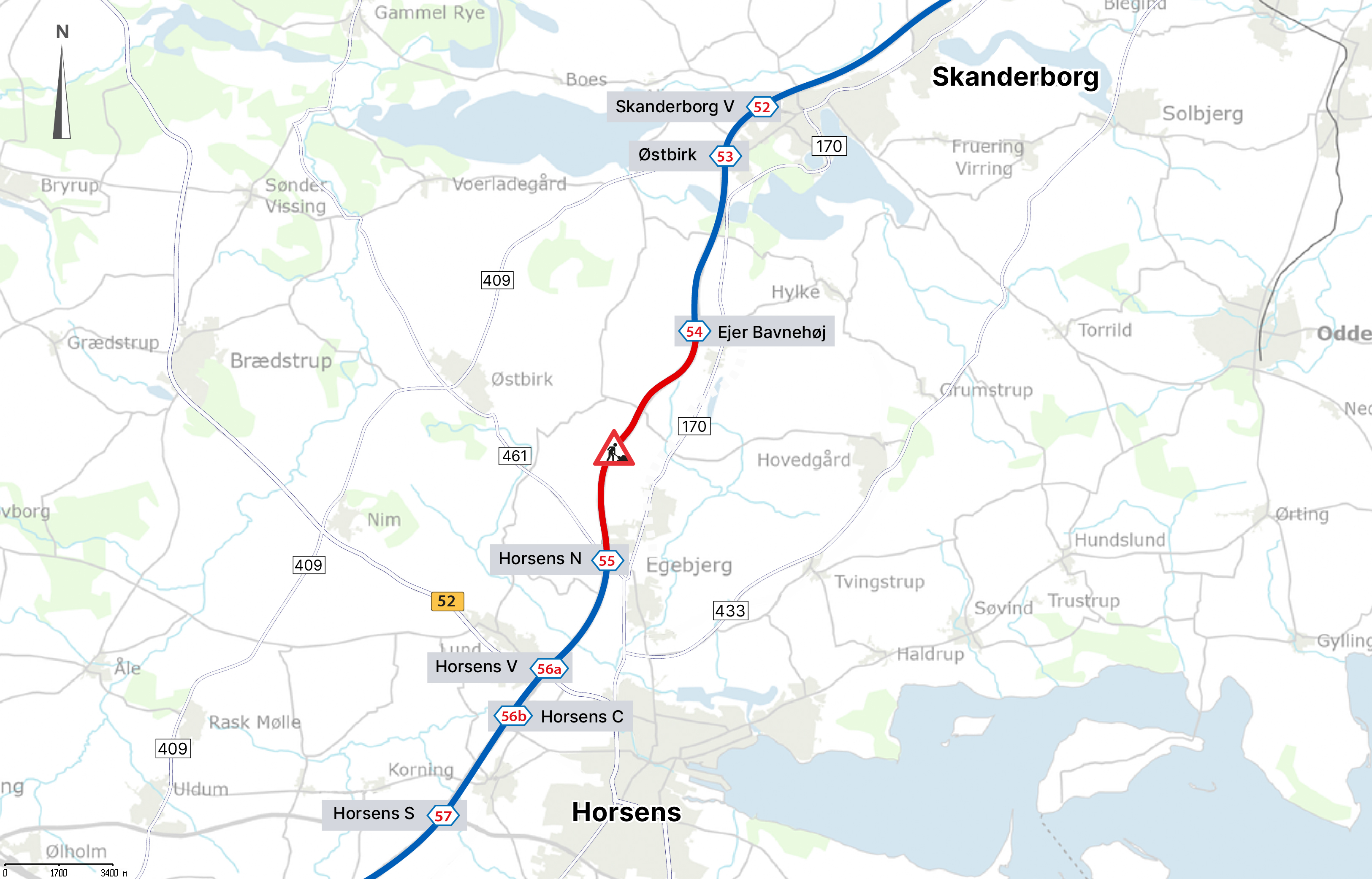 Efter påske starter arbejdet så op i dagtimerne, hvor asfalten på E45 Østjyske Motorvej mellem 55 Horsens Nord og 54 Ejer Bavnehøj skal fornyes.