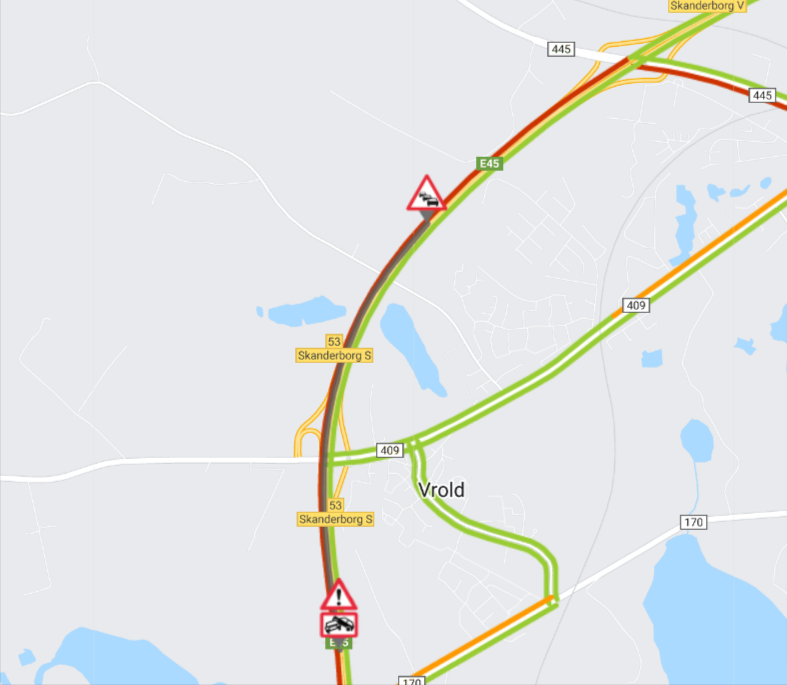 På E45 i sydgående retning, mere præcist mellem 53 Skanderborg S og 54 Ejer Bavnehøj er der nemlig lige nu kun et spor farbart, og det betyder, at der er kilometerlang kø på strækningen.